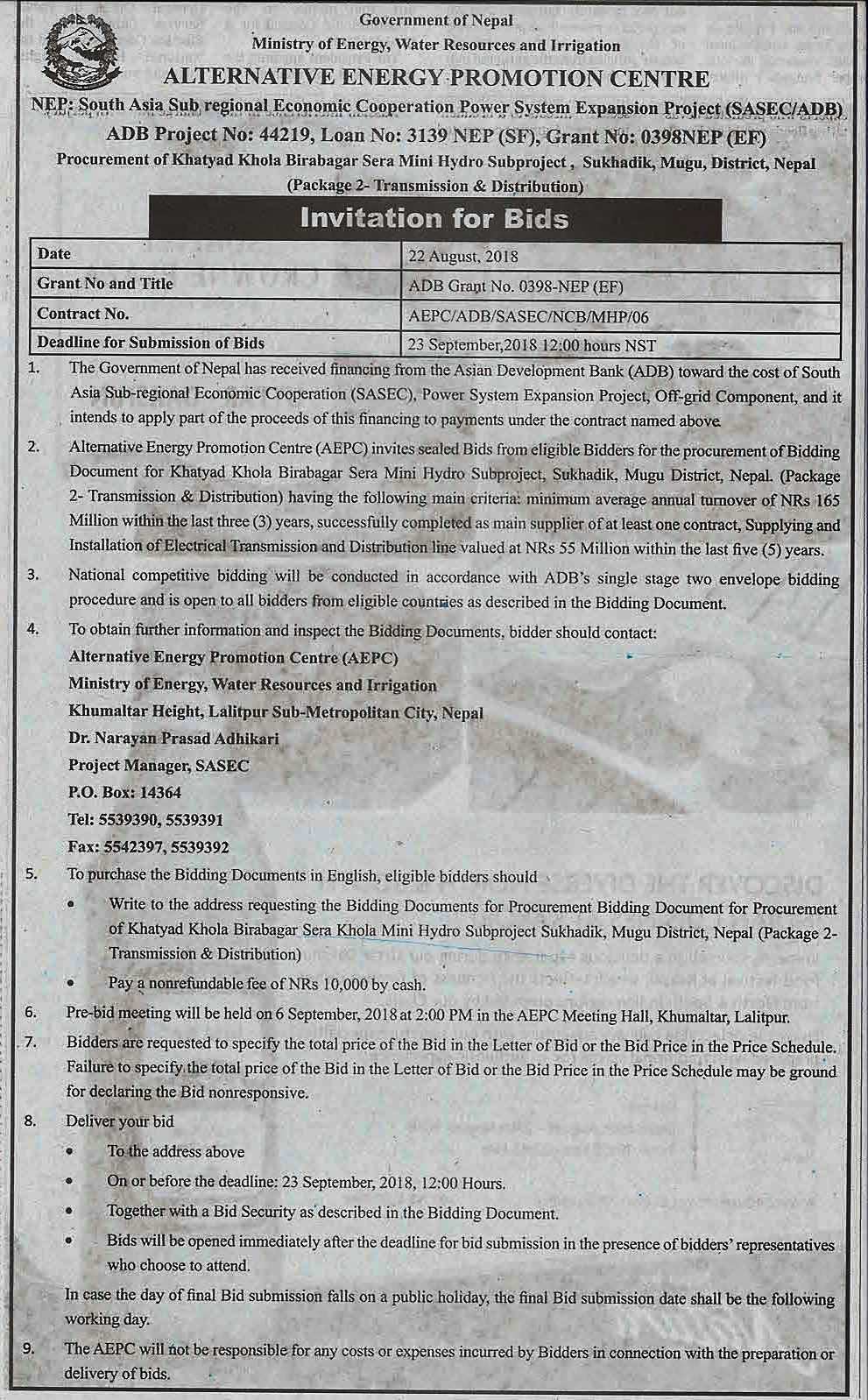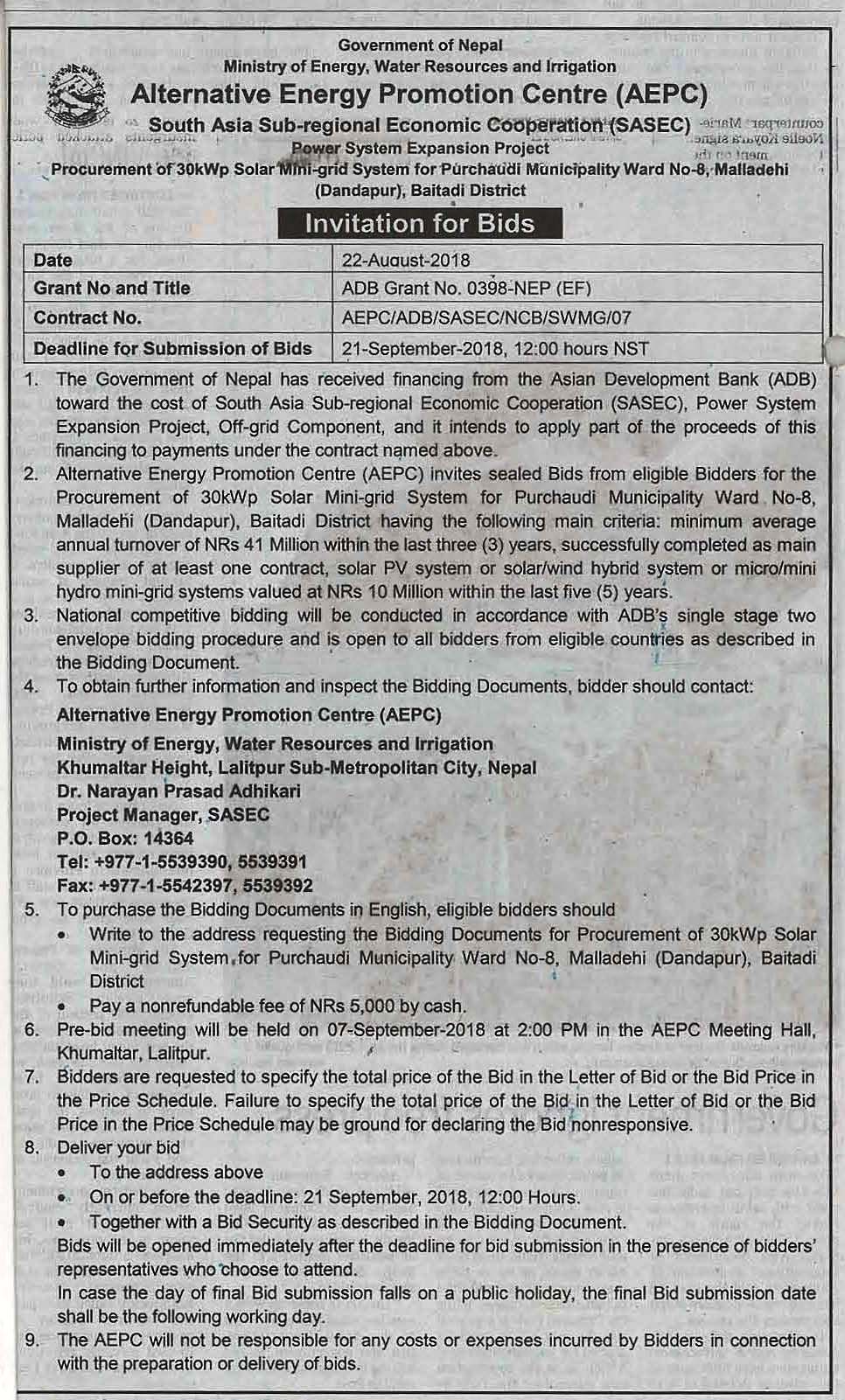 Alternative Energy Promotion Centre (AEPC) invites sealed Bids from eligible Bidders for the procurement of bidding Document for Khatyad Khola Birabagar Sera Mini Hydro Subproject, Sukhadik, Mugu Disrtict and 30 kWp Solar Mini-grid System for Purchaudi Municipality Ward No: 8, Malladehi (Dandapur), Baitadi District. Refer to the notices below for details;