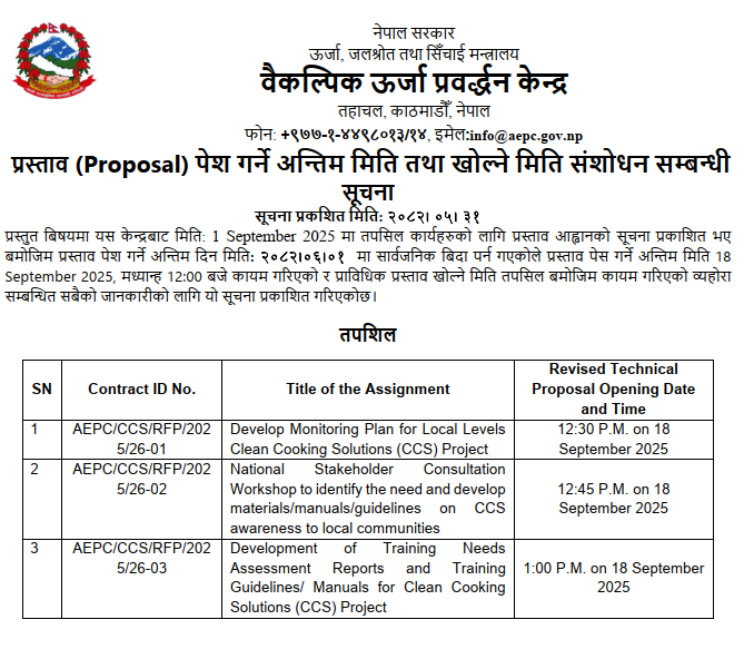 प्रस्ताव (Proposal) पेश गर्ने अन्तिम मिति तथा खोल्ने मिति संशोधन सम्बन्धी सूचना