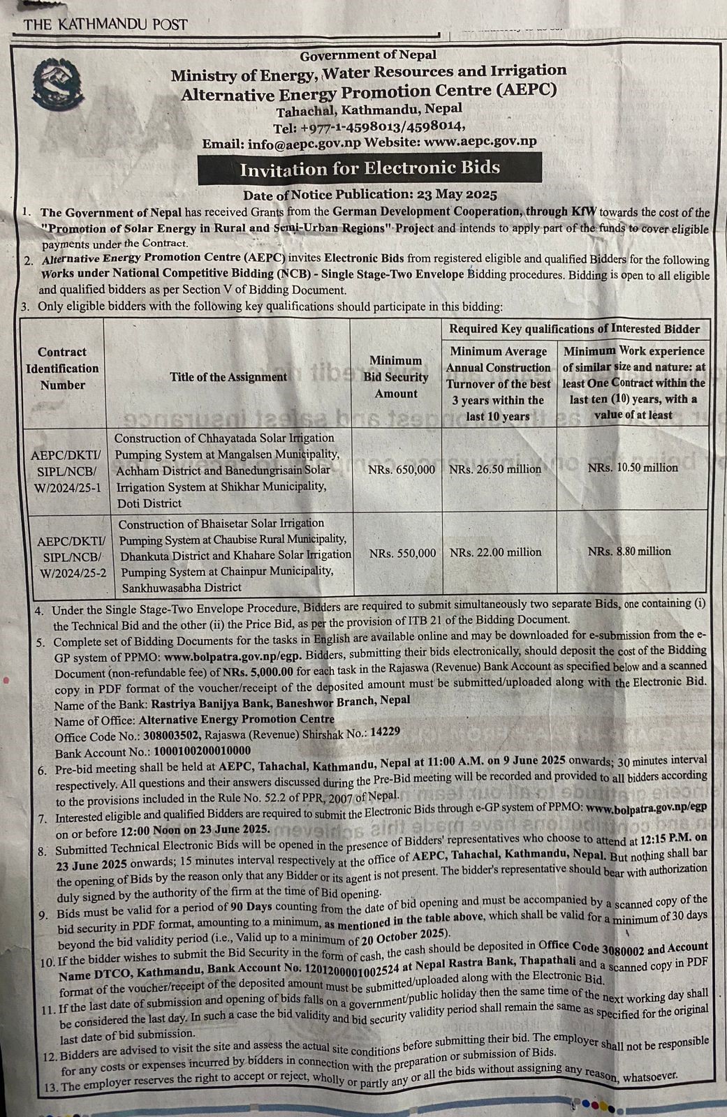 कृषि सिंचाइका लागि सौर्य पम्प जडान कार्यक्रम कार्यान्वयन गर्न आयोजनाहरुको तेस्रो लट छनोट गरिएको सूचना