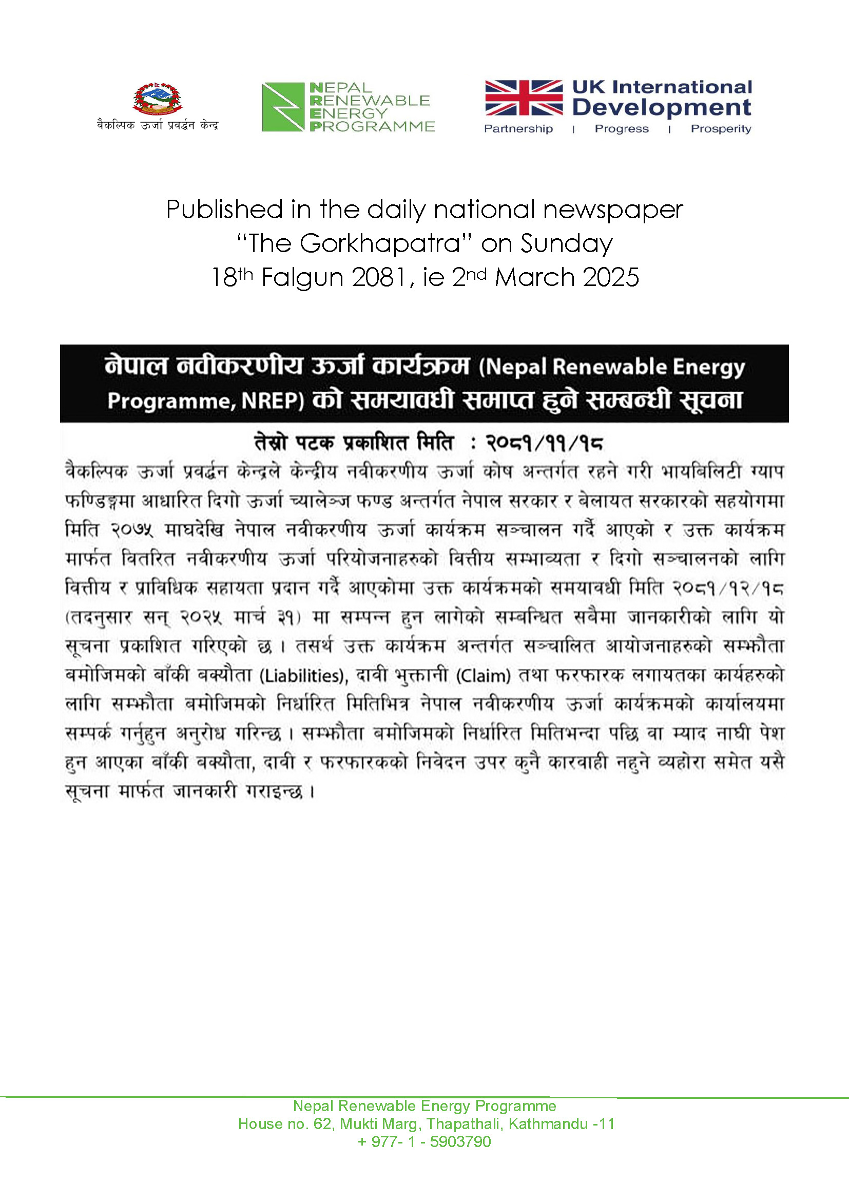नेपाल नवीकरणीय ऊर्जा कार्यक्रम (Nepal Renewable Energy Programme, NREP) को समयावधी समाप्त हुने सम्बन्धी सूचना